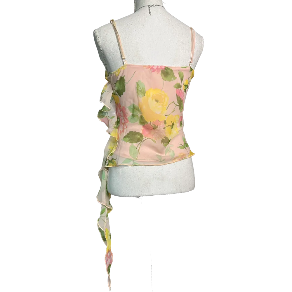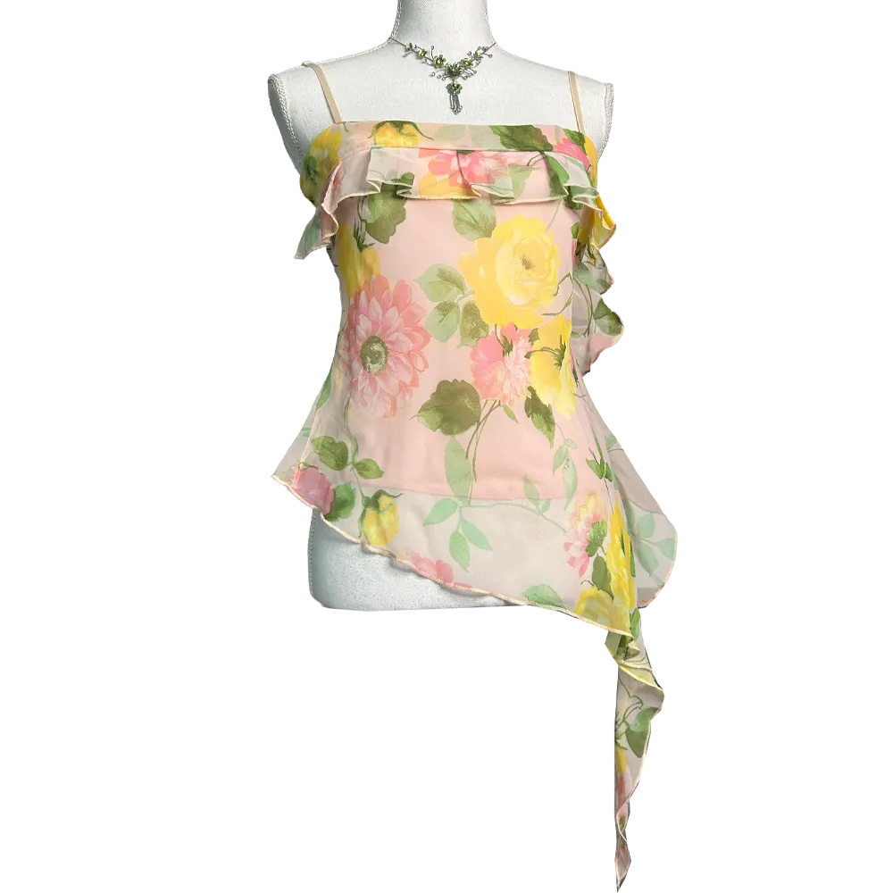 Cute little pink floral summer top with asymmetrical Fairycore ruffles by French brand Morgan de toi vintage 2000’s.