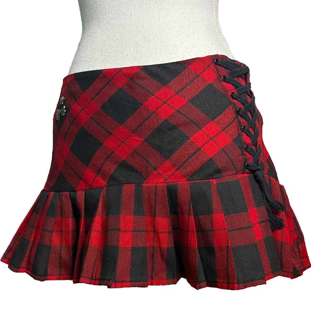 Sublime 2000s vintage red tartan pleated mini skirt with lacing on left side.