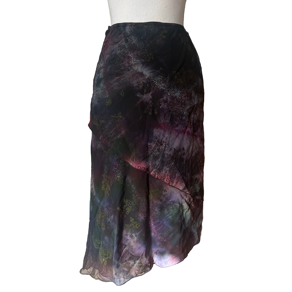 Sublime jupe Tie and Dye asymétrique à motifs fleuris délicatement pailletées, vintage des années 90 Made in France .