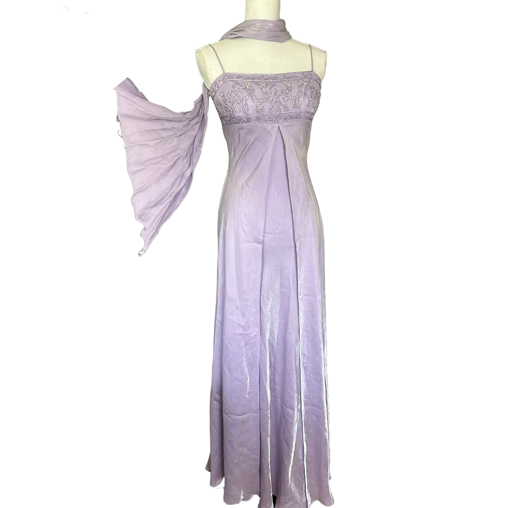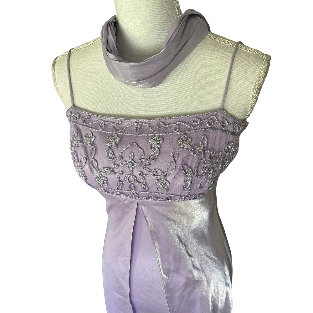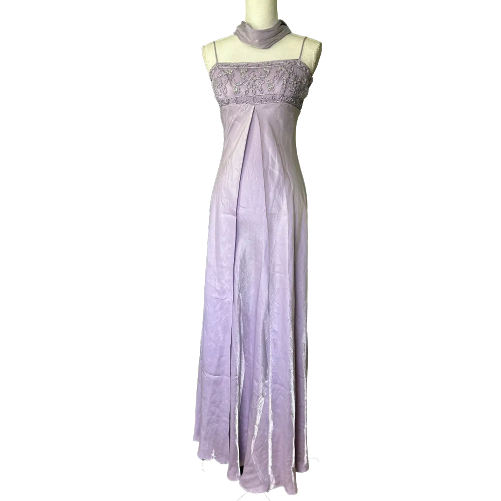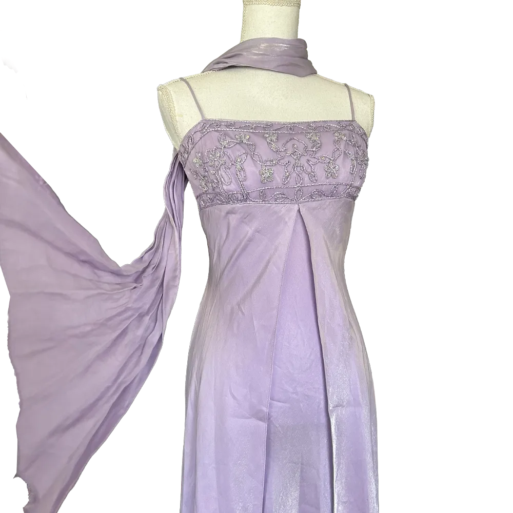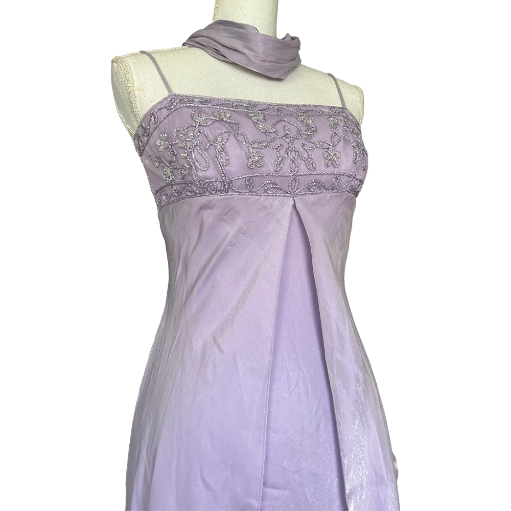 Sublime robe de bal de promo style empire couleurs Lilas, bustier brodé effets argenté et foulard assorti, vintage des années 90 Made in USA