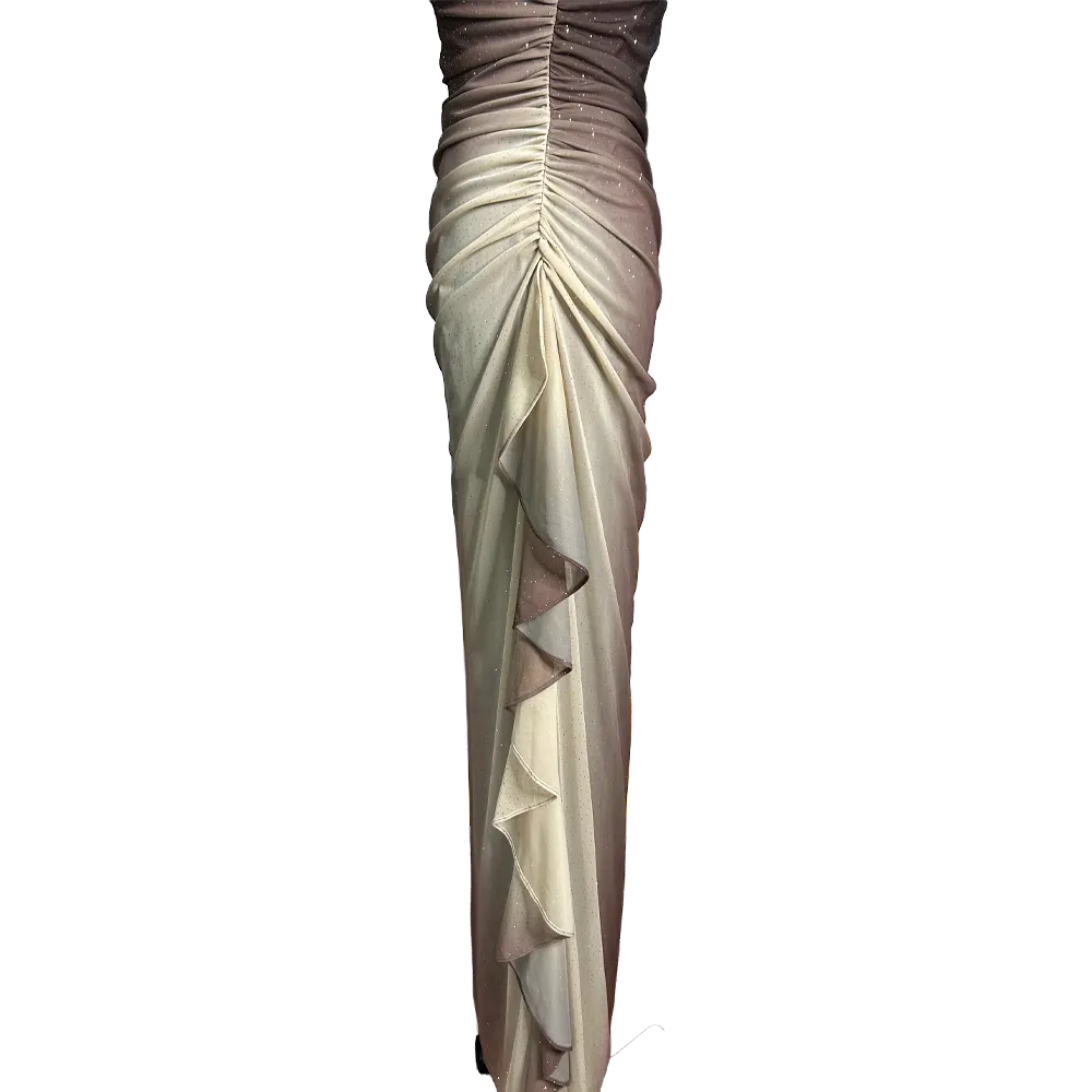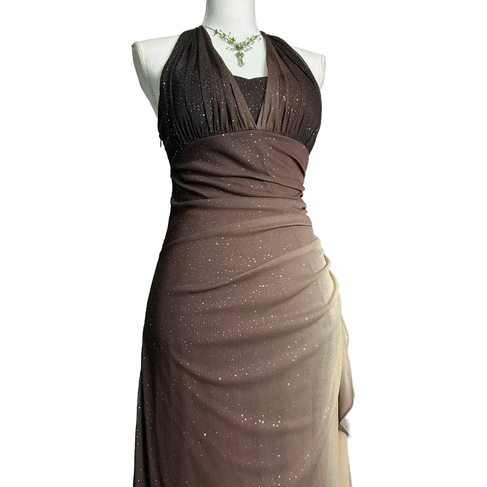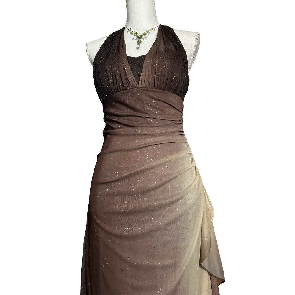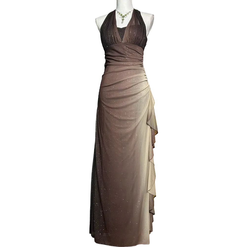 Prom dress marron dégradé beige pailletées à volants Vintage années 2000
