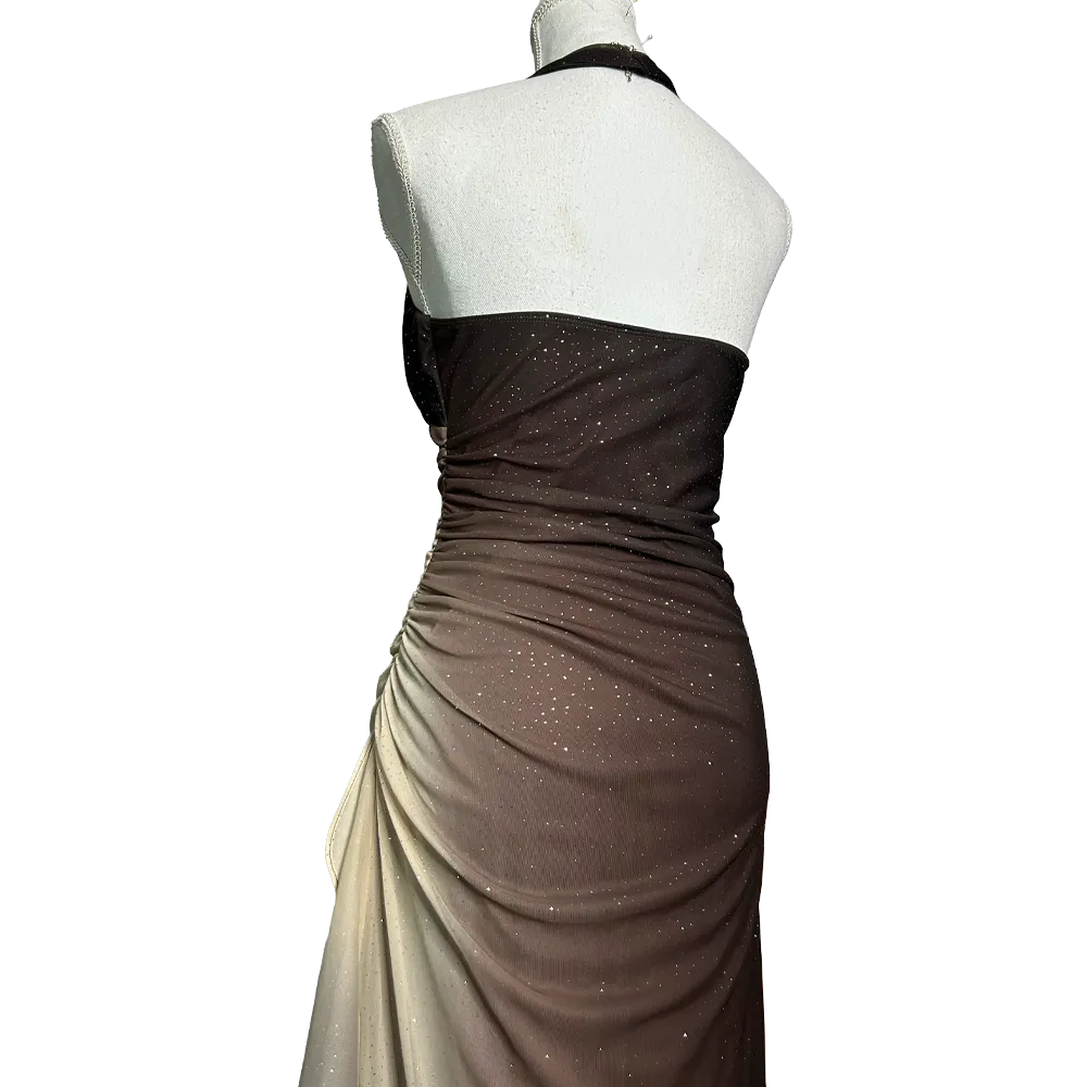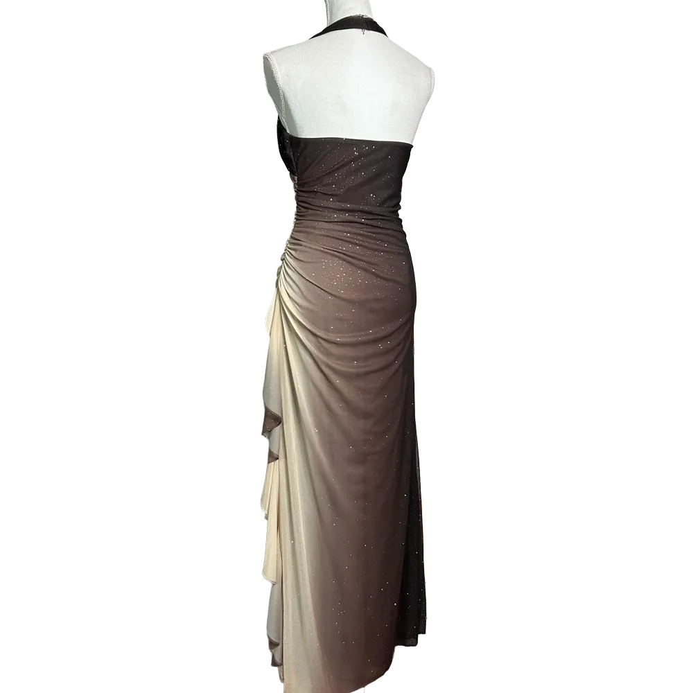 Sublime robe de bal de promo moulante marron dégradé beige à paillettes, dos nu et volants sur le côté de la robe. Pièce vintage des années 2000!