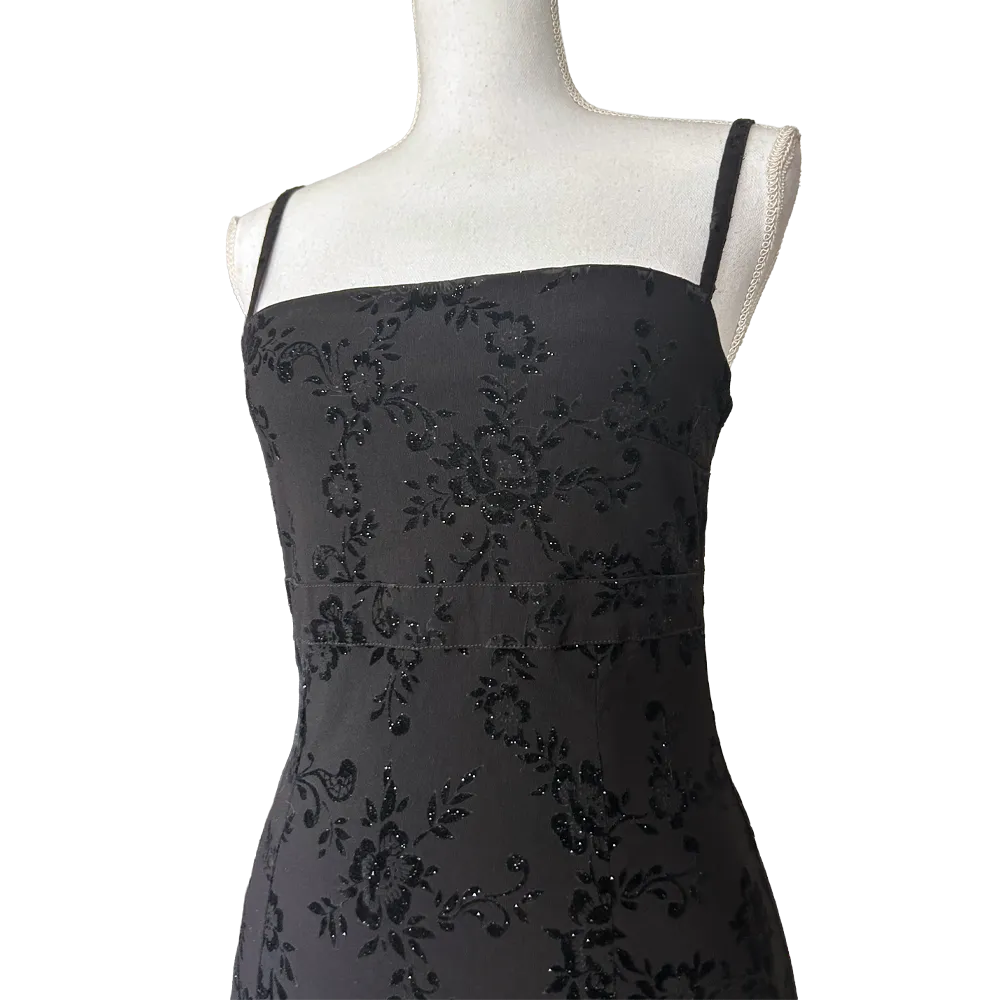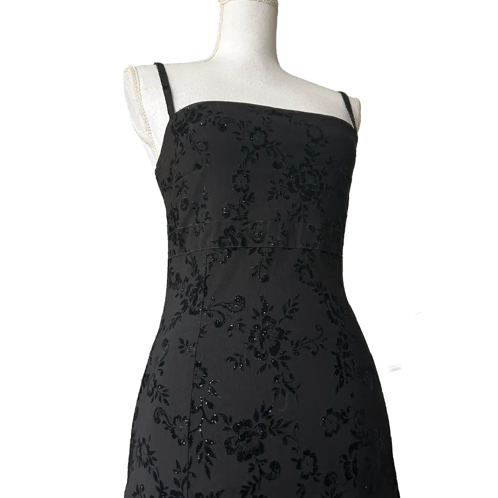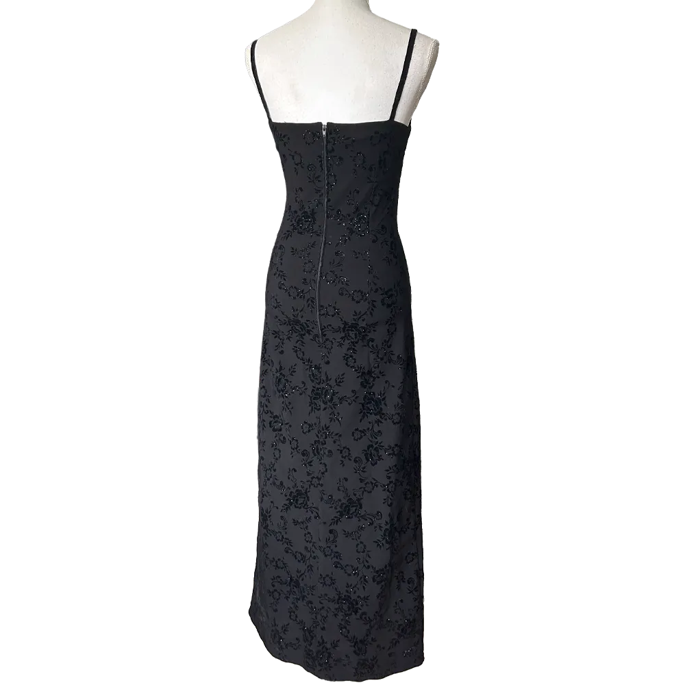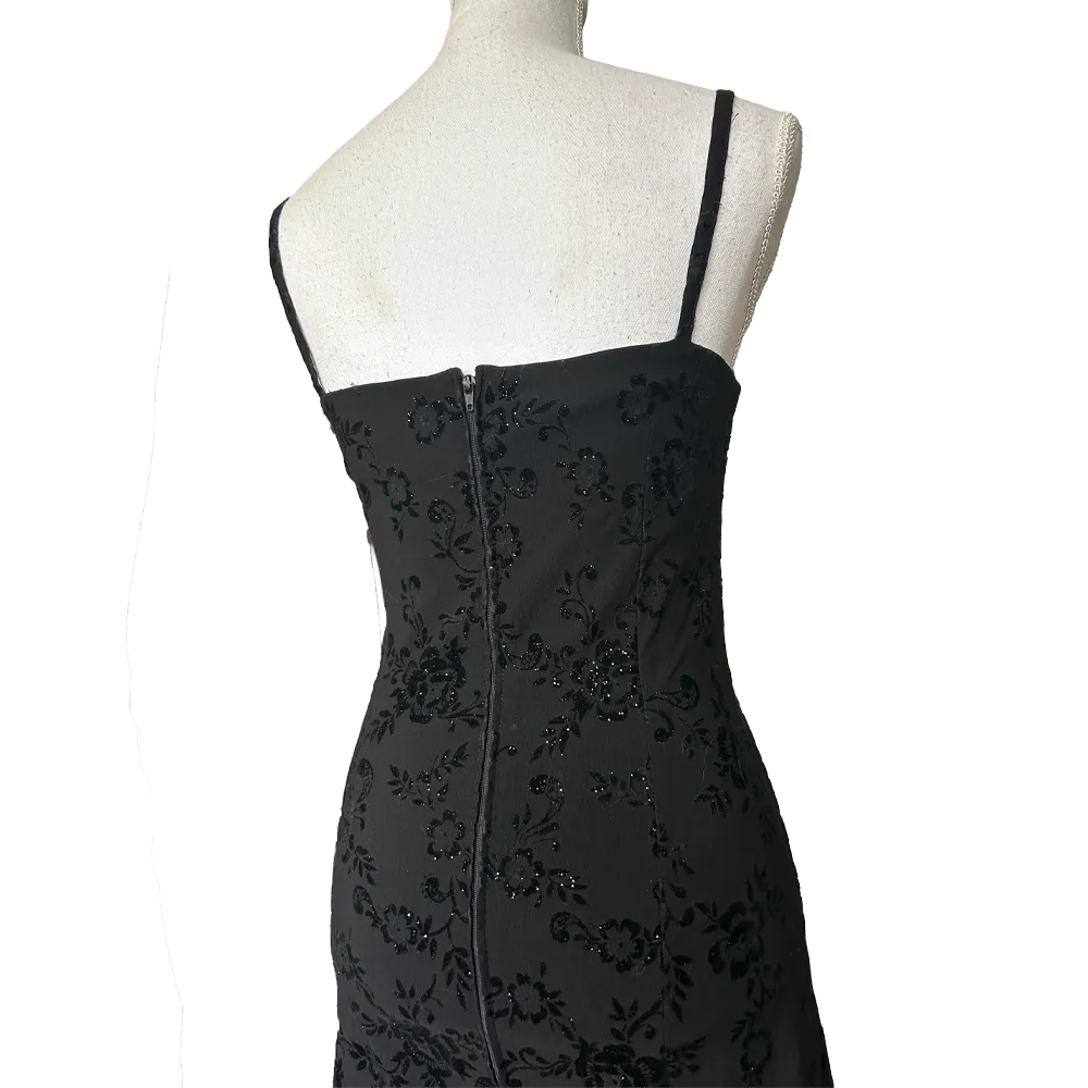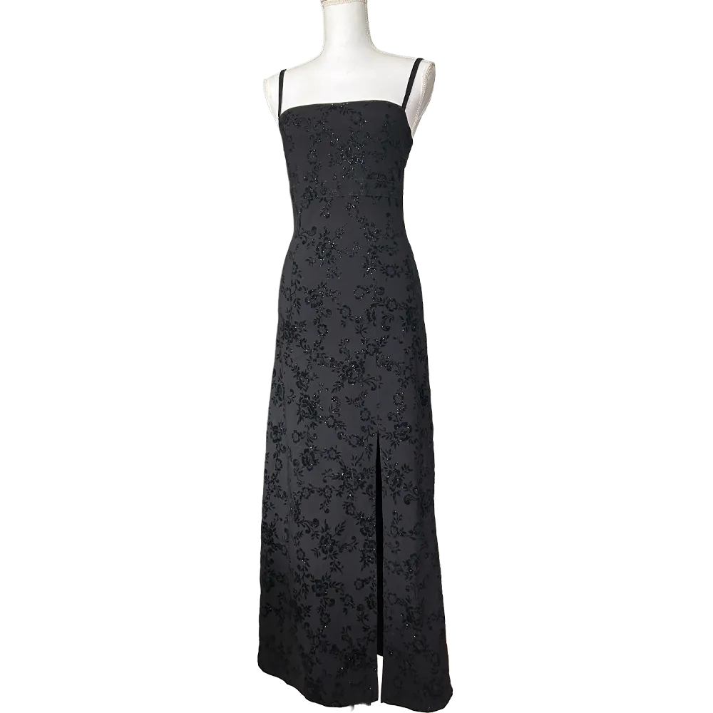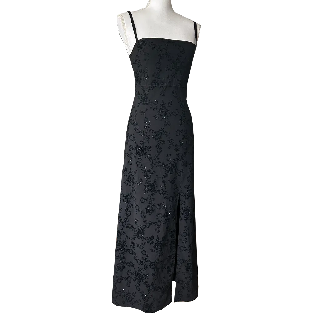 Sublime robe de bal de promo droite noir à fleurs en velours pailletées et une longue fente, vintage des années 90-2000.