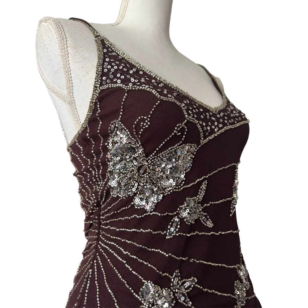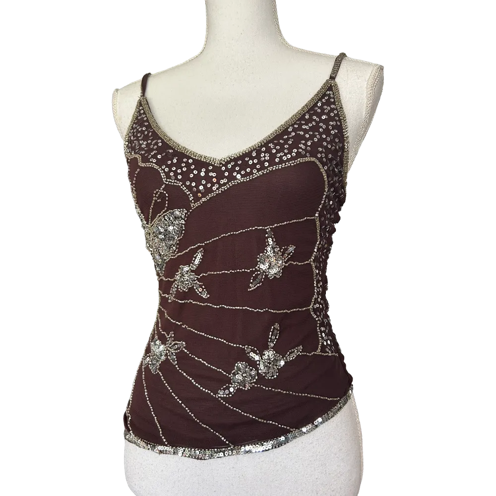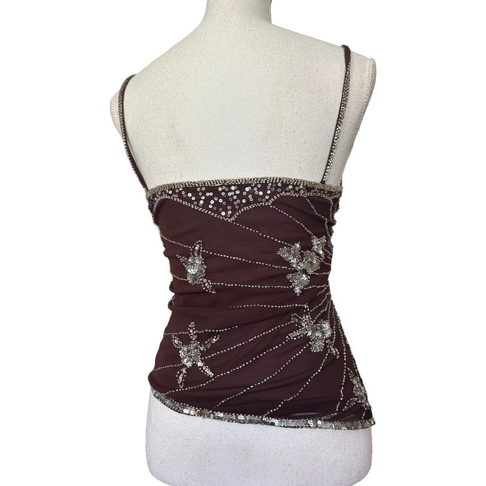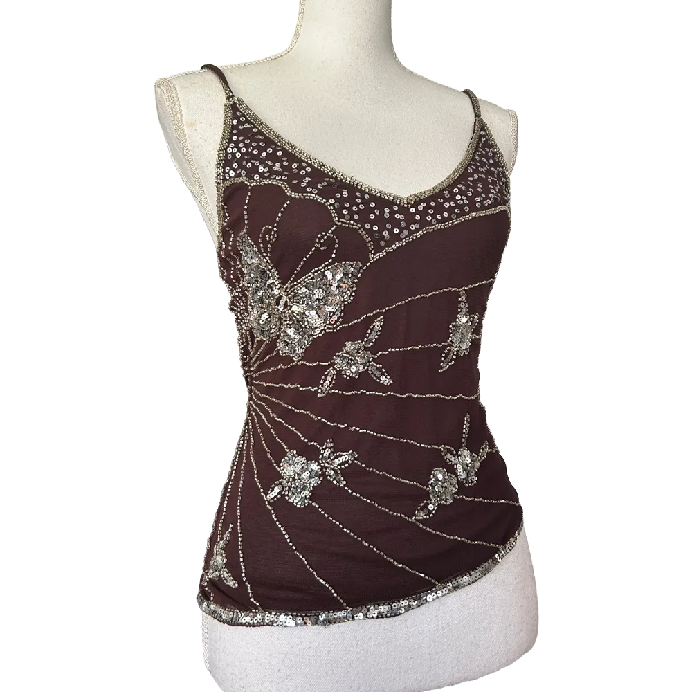 Sublime top à bretelles asymétrique marron avec broderies en perles argenté motifs papillons, Fairycore vintage des années 2000.